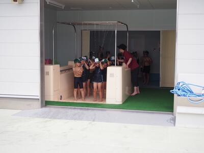 服が水を含むと重くなることや、あわてて泳ごうとすると体力を消耗してしまうことなど、体験を通して多くのことを学んだ様子でした。消防署の皆様、命を守る大切な学習をしていただき、ありがとうございました。