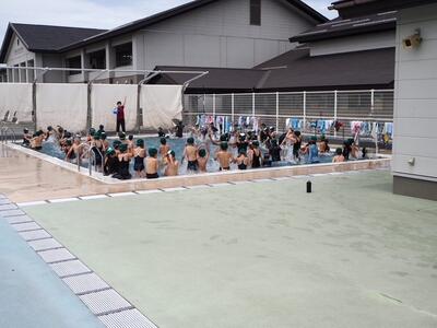 本日3校時に、全校のトップを切って2年生が水泳学習を行いました。朝から気温はぐんぐん上がり、学習時には気温31度、水温も25度と、水泳にはまさに絶好のコンディションでした。