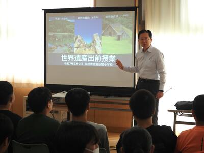 7月9日(水)の3校時に、6年生を対象に「世界遺産出前授業」が行われました。講師としてお越しいただいたのは、なんと達増拓也岩手県知事です。
