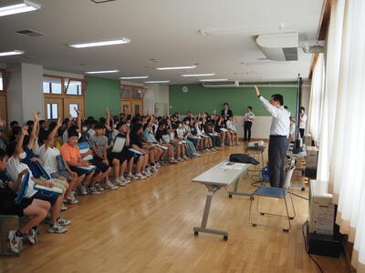 はじめに、県内3つの世界遺産に関する3択クイズが出され、子どもたちは正解が発表されるたびに歓声を上げたり、悔しがったりと、盛り上がりました。その後、世界遺産とは何か、そして岩手県内の3か所の世界遺産について、知事自らわかりやすく説明してくださいました。