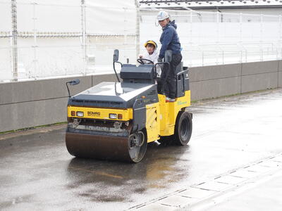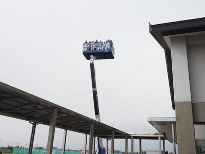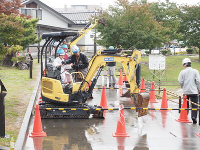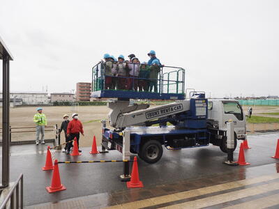 小雨の降る中でしたが、子どもたちは元気いっぱい。ハイリフトに乗って校舎の屋根と同じくらいの高さまで上がると、「わあ、すごい!」と歓声を上げていました。また、コンバインドローラーやバックホウの操作を実際に体験させていただき、建設の仕事の面白さや迫力を間近に感じることができました。