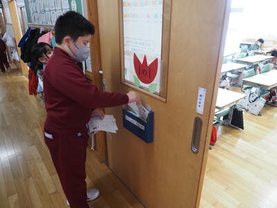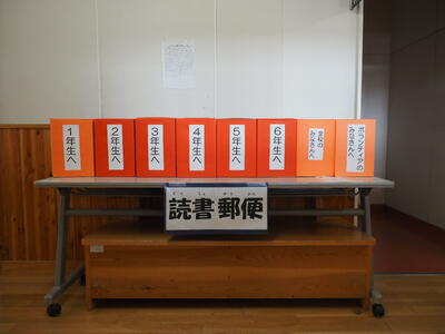 図書室前には、学年ごとの専用ポストを設置しています。中休みや昼休みには図書委員がポストを回収し、宛先の児童がいる学級のポストへ丁寧に配達しています。まるで本校だけの小さな郵便局ができたようで、受け取った児童も嬉しそうに読んでいます。
