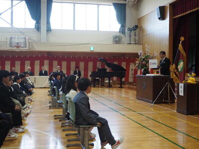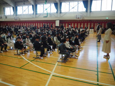 また、式の中では、児童代表による歓迎の言葉もありました。これまでの学校生活の様子や楽しい行事について紹介しながら、「一緒に楽しい思い出をつくりましょう」と、新入生に優しく呼びかける姿が印象的でした。新入生も安心した表情で耳を傾けていました。