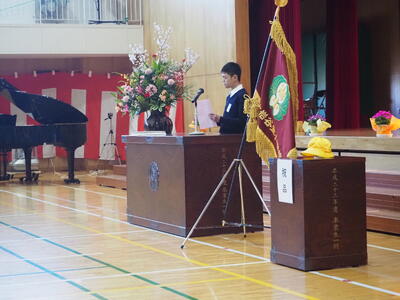 少し緊張した様子で入場してきた新入生でしたが、式が進むにつれて表情もやわらぎ、これから始まる学校生活への期待が感じられました。担任の先生から名前を呼ばれると、元気よく返事をする姿も見られ、大変立派でした。